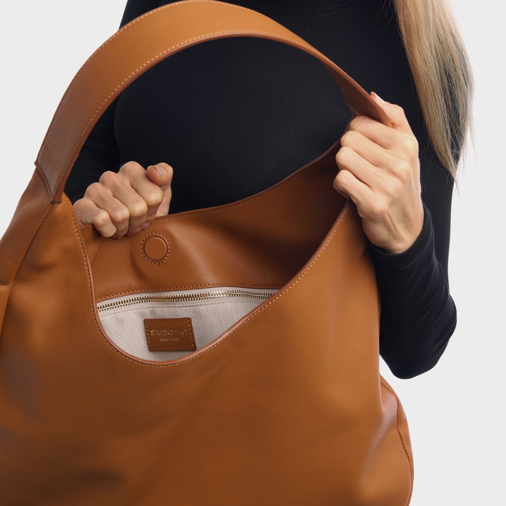 Una borsa hobo morbida e spaziosa, realizzata in pregiata pelle di vitello.