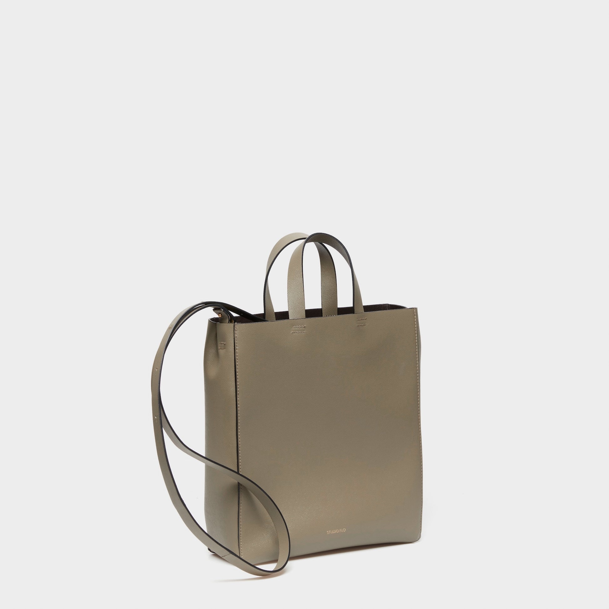 Handbag with adjustable strap made of calf leather, featuring a nappa leather interior and an open pocket.
