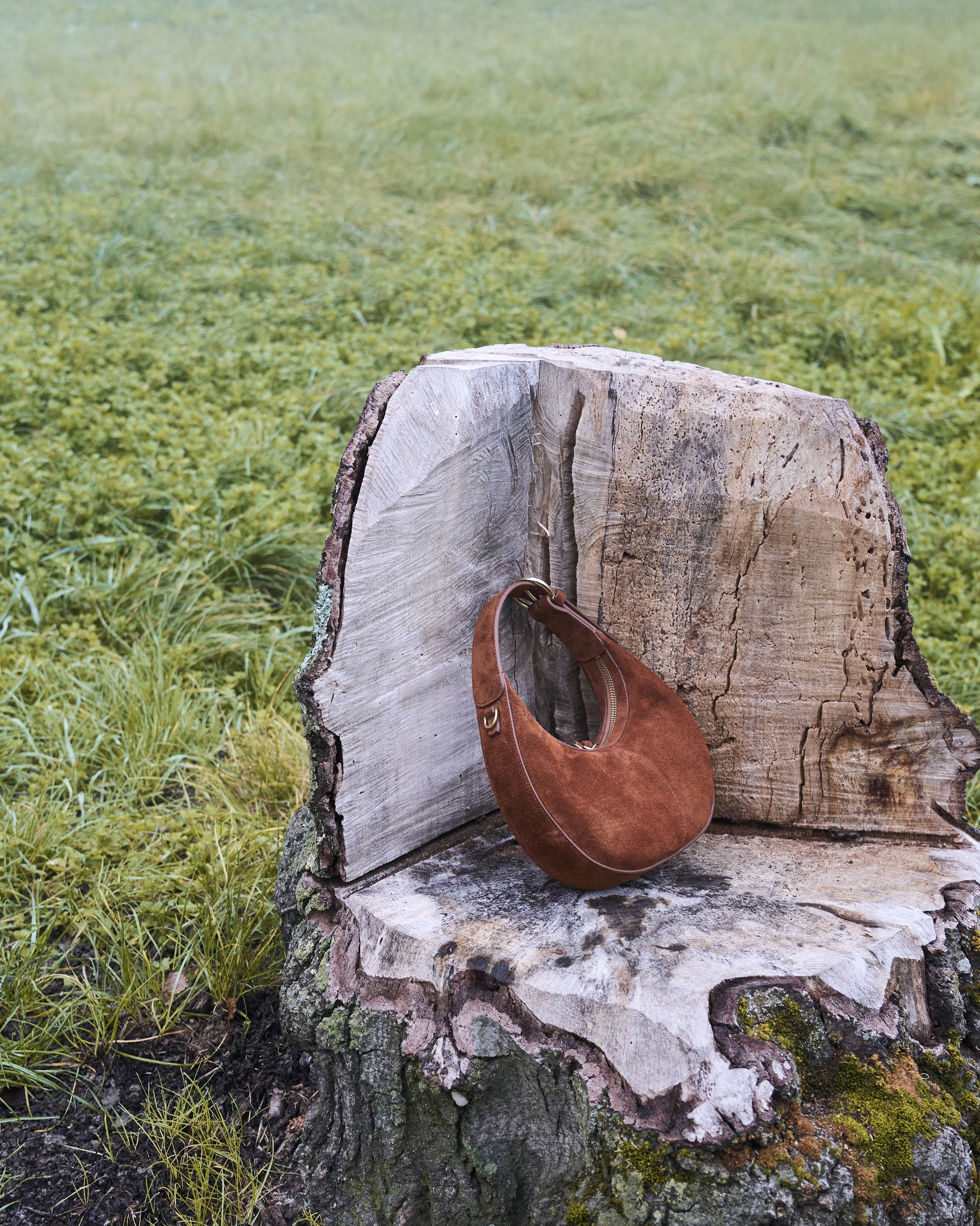Compact and sophisticated, this crescent-shaped shoulder bag is crafted from smooth suede leather and embellished with the brand’s signature curved stitching. Minimalist design of silhouette and handle, combined with an adjustable crossbody strap. Brown color.