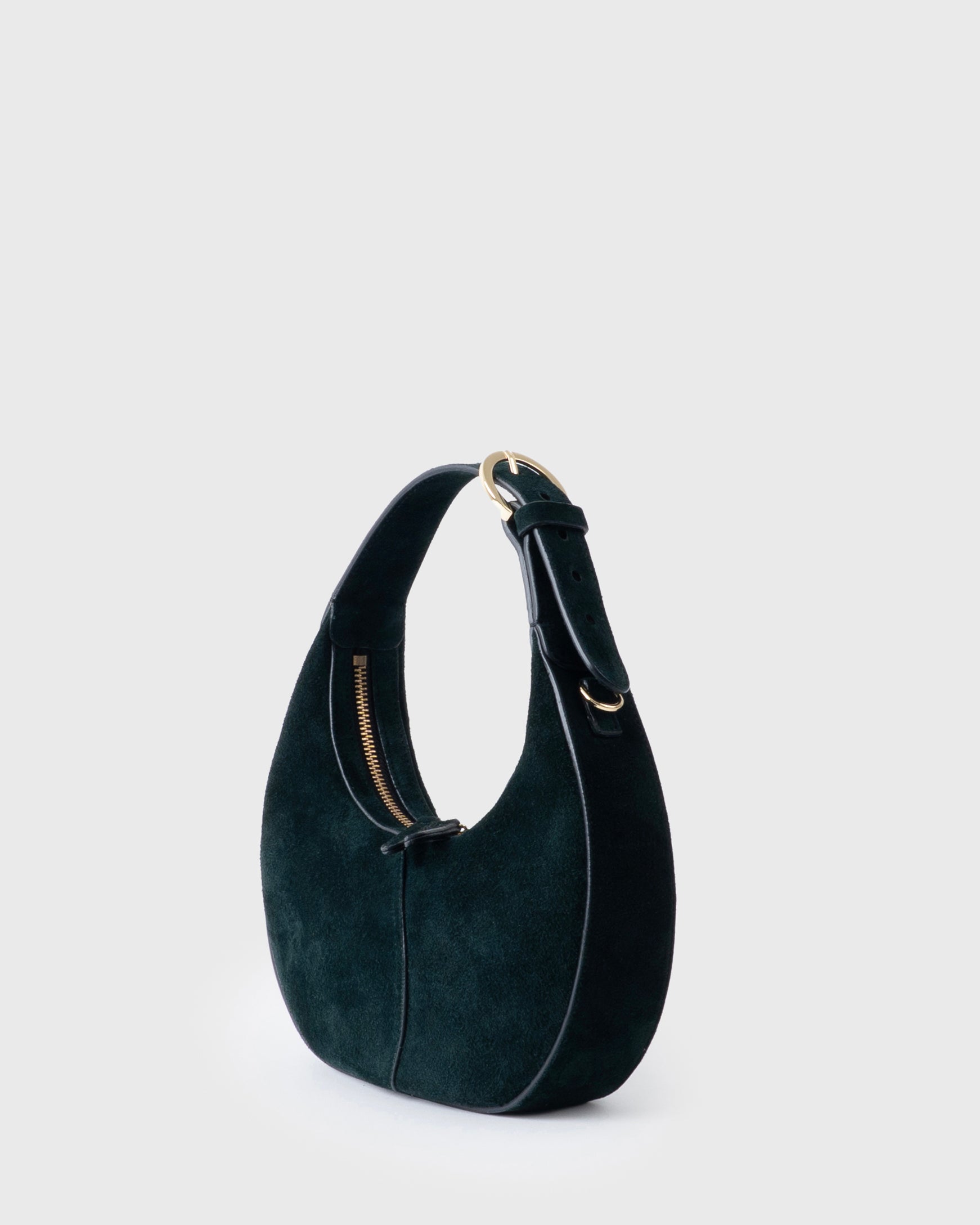 Compact and sophisticated, this crescent-shaped shoulder bag is crafted from smooth suede leather and embellished with the brand’s signature curved stitching. Minimalist design of silhouette and handle, combined with an adjustable crossbody strap. Deep green color.